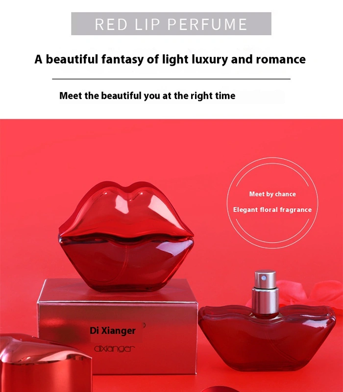 - Red lip shaped perfume bottle with aluminum nozzle, detailed design, and eco friendly paper box packaging.