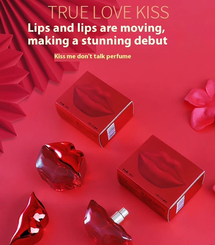 - Red lip shaped perfume bottles labeled “TRUE LOVE KISS” with red boxes, petals, and fan decorations.